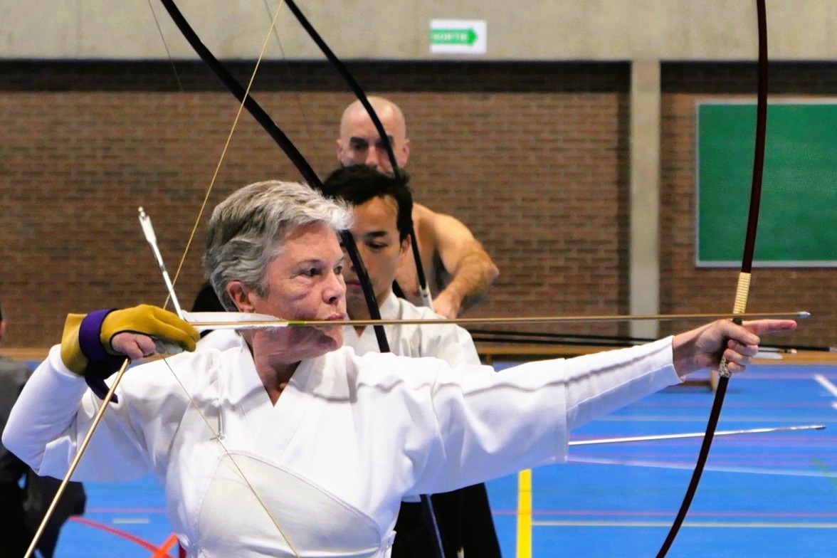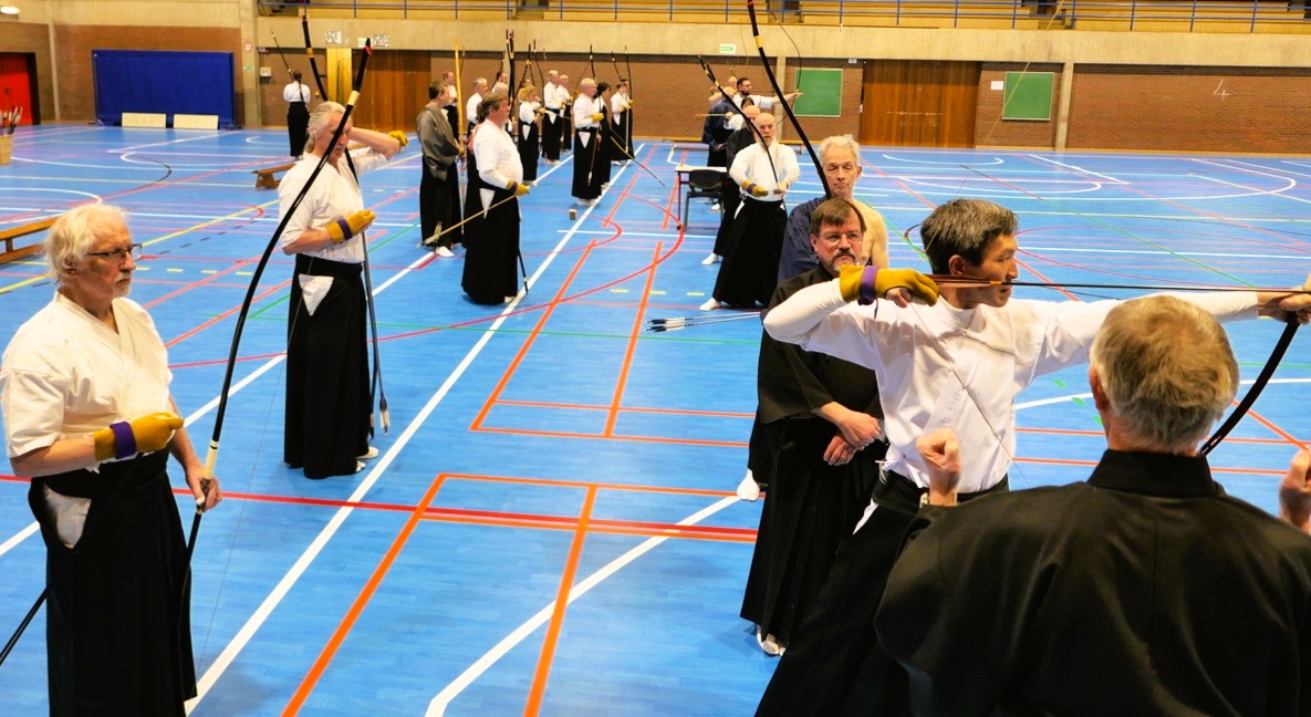 Ils étaient répartis par grade sur deux shajo de cinq mato. Sous la direction d’Alain Dubois, Renshi Godan et Constant Piqueray, Godan, assistés des responsables des autres dojo, ils ont travaillé le shinsa no mai le matin et la technique de tir l’après-midi. En guise de sieste, les plus hauts gradés ont expérimenté les joies du mochi mato sharei le samedi et du rôle de kaizoe dans le yawatashi le dimanche.